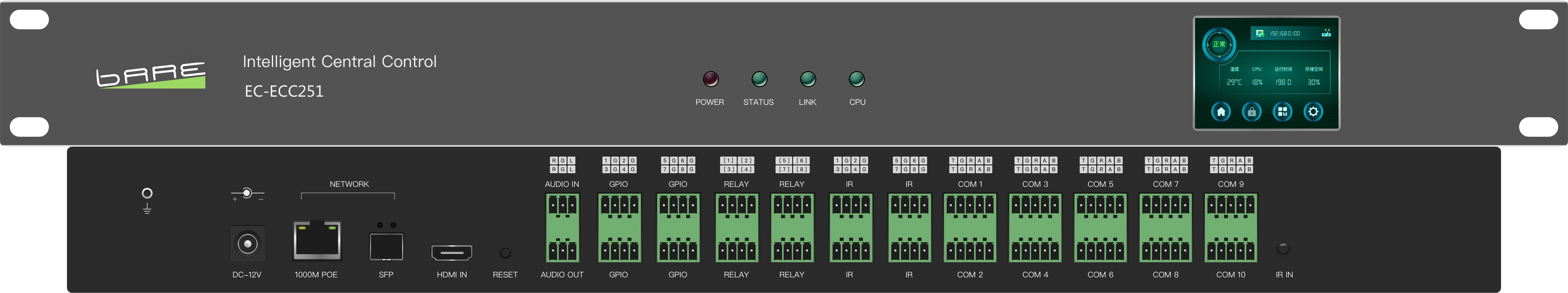 控制接口:RS232*6,RS485*4,IR*8,Relay*8,1/0*8;RS232/485 支持双向中央控制功